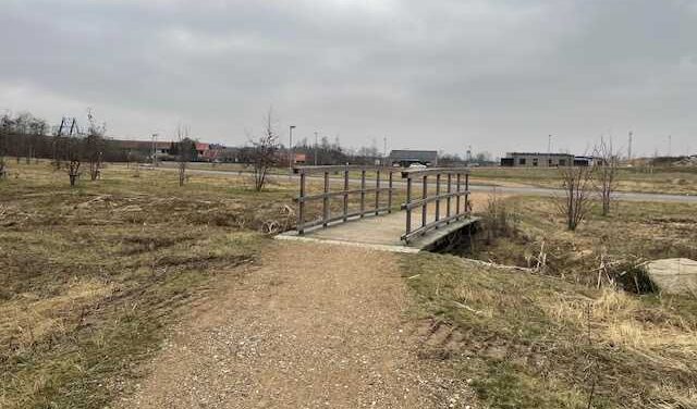 Vi skal gå en tur i mit nye boligområde. Her er fine anlagte stier med hele 3 broer og vandhuller.